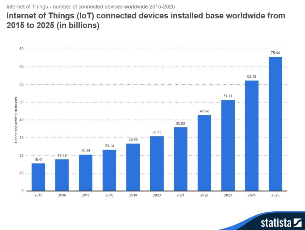 According to statistics, in the year 2015, we had around 15.4 billion interconnected devices, and by 2025 it is estimated to reach a whopping 75.4 billion!
